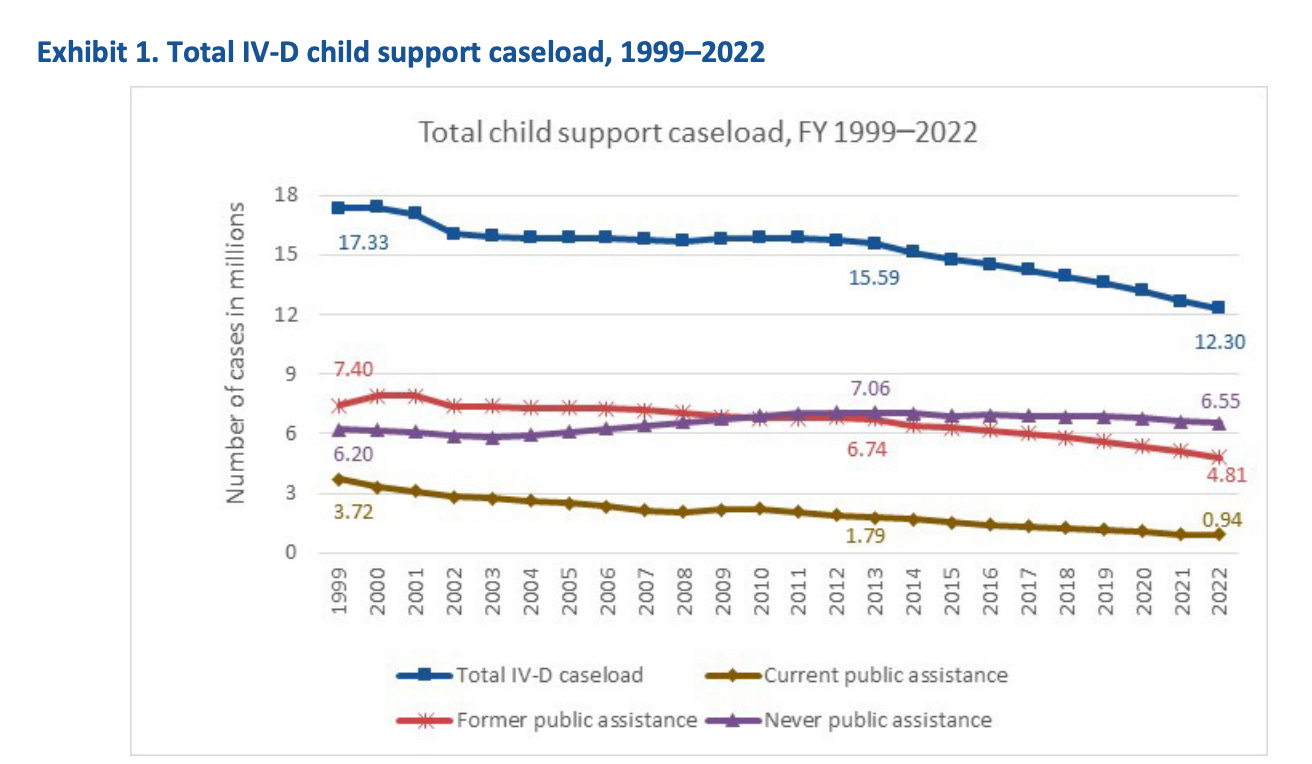 In the 23 years ended 2022, total child support cases filed through the state dropped by 29%. Rates of poor moms filing for support fell at an even more accelerated rate further while women who are not or have never been on public assistance are more likely than ever to file: